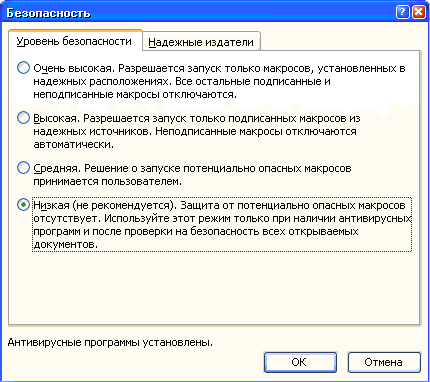 2) в приложении Excel или Word (там, где происходит работа в текущий момент) выполнить команду: Сервис + Макрос + Безопасность;