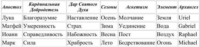 Мистический сезон каждой из Кардинальной Добродетели соответствует земному сезону, Элементу, темпераменту, виду аскезы, а также одному из аспектов Божественного Тетраморфа, и относящемуся к нему Ангелу, как показано на следующей Таблице.