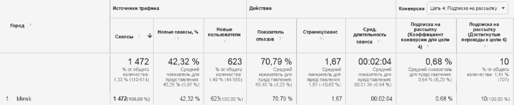 Теперь в любом из отчетов во вкладке конверсии вы можете просматривать данные о достижении вашей цели (какое количество посетителей ее достигло) и сравнивать по коэффициенту конверсии разные каналы и сегменты аудитории.