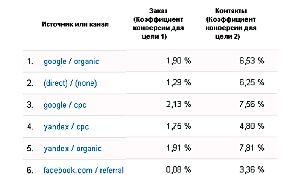 Как выглядят данные Google Analytics, если целей нет? Мы просто видим, что такой-то источник дал столько-то трафика. И что? Достаточно настроить цели для того, чтобы ответить на вопрос, какие источники приносят не просто трафик, но и заказы. А самое важное узнать, кто это делает более эффективно.