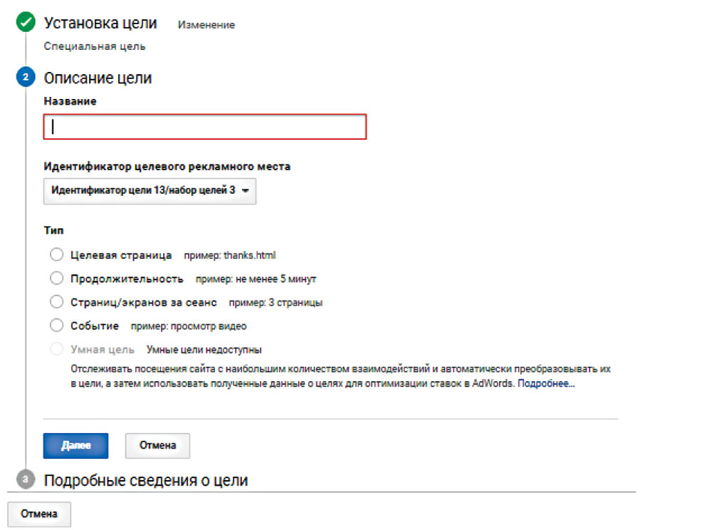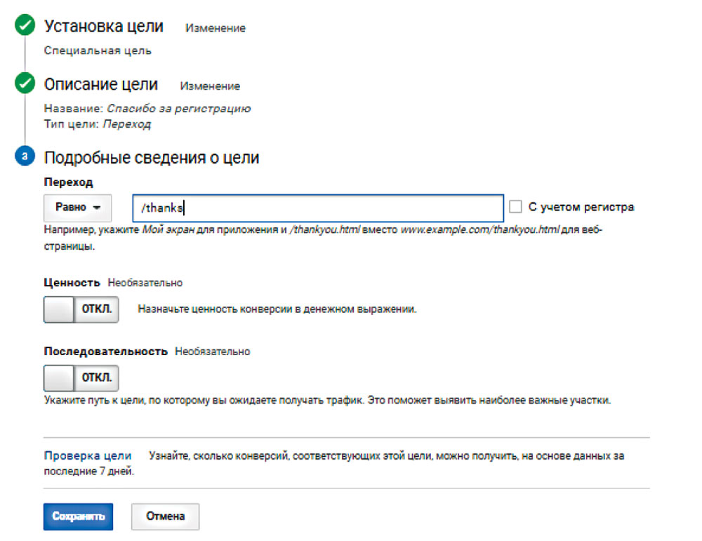 Настройка целевой страницы в Google Analytics