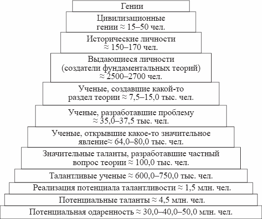 Социальная пирамида по одаренности включает такие уровни степени одаренности, как творческая личность, талант, гений – восходящие ступени интеллектуального и творческого развития человека. Гений венчает и завершает развитие творческой личности, таланта. Но общество не может состоять только из одних гениев.