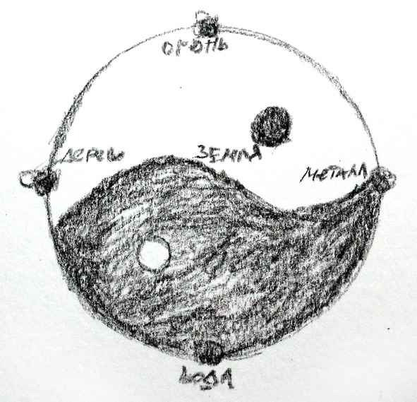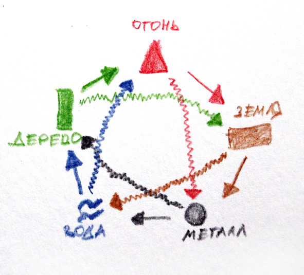 После того, как Инь и Ян разделили сферы влияния, были рождены 5 первоэлементов, из которых складывается разнообразие Мира, включая Человека. 5 первоэлементов (стихий) также всегда в движении и гармонии, порождают или преодолевают друг друга последовательно.