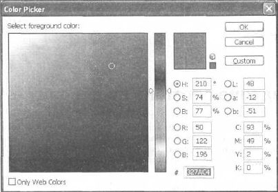Создайте новый документ размером 800x800 с прозрачным фоном. Щелкните в палитре инструментов на верхнем квадратике с цветом и введите 327АС4, определив тем самым цвет переднего плана Select foreground color (рис. 3.1).