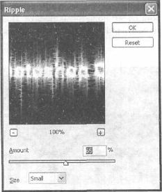Выполните команду Filter | Distort | Ripple (Фильтр | Деформировать I Рябь) (рис. 2.8). Объяснять значения параметров не стоит, вы вполне сами можете с ними поэкспериментировать (рис 2.9).