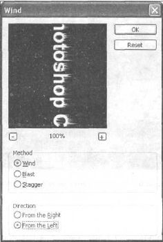 Выполните команду Filter | Stylize | Wind (Фильтр | Стилизация | Ветер). Выберите Method (Метод) Wind (Ветер) и Direction (Направление) From the Left (От левою края). Нажмите ОК (рис. 2.5), затем комбинацию клавиш <Ctrl>+<F>.