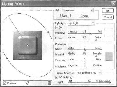 Удерживая клавишу <Ctrl>, щелкните на слое, к которому вы применяли Lighting Effects (Световые эффекты), и воспользуйтесь фильтром Gaussian Blur (Размытие по Гауссу) с величиной 6. Кнопка станет гладкой и приятной на вид.