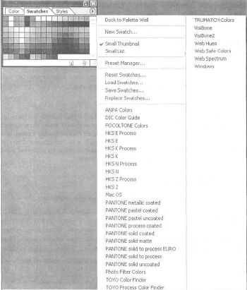 Если вам не хочется искать среди спектров палитр какой-либо цвет, то Swatches (Образцы) для вас. Она имеет огромный набор уже готовых, часто используемых цветов. Вам остается только выбрать. Отдельные образцы можно добавлять или удалять из палитры. С помощью команд меню можно загружать, присоединять и сохранять палитры цветов, определенные пользователем. Используя кнопки управления, можно создавать новый образец