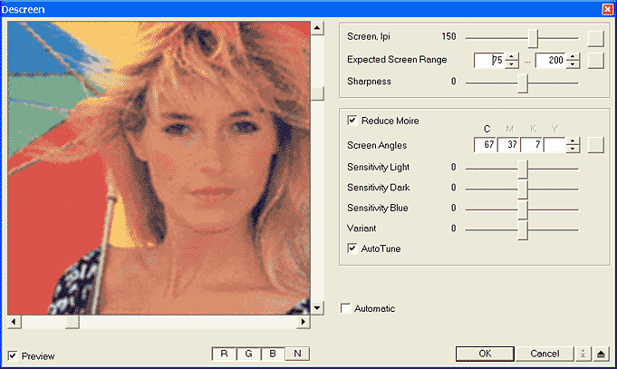 Если вам удалось успешно удалить растр и розеточный муар, попробуйте удалить розеточный муар не только из каналов Red и Green, но и из канала Blue. Откройте исходное изображение. Для удаления розеточного муара из канала Blue должны быть заданы углы наклона растров не только красок CMK, но и краски Y. Для этого включите просмотр канала Blue (нажав кнопку B) и нажимая маленькие стрелочки рядом с ячейкой Y, выберите такое значение угла, при котором наблюдаемый муар будет минимальным. Затем, просматривая канал Blue, подберите такое значение регулировки Sensitivity Blue, при котором муар в этом канале будет наименьшим. Когда все углы заданы, нажмите OK.