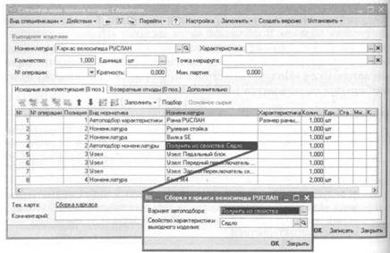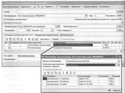 В спецификации выходного изделия способ автоподбора описывается следующим образом. В табличной части закладки «Исходные комплектующие» в колонке «Вид норматива» указывается вариант «Автоподбор номенклатуры», а в колонке «Характеристика» указываются вариант автоподбора «Получить из свойства» и свойство, по которому будет подбираться номенклатура комплектующей.