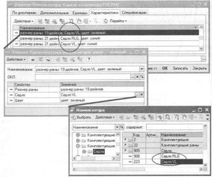 Конкретные значения свойства указываются в форме элемента справочника «Номенклатура» на закладке «Характеристики».