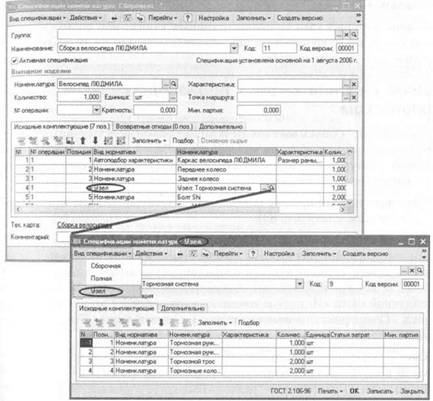 Но в табличной части спецификации устанавливается связь с процессом изготовления: для каждой входной позиции номенклатуры указывается номер технологической операции, перед выполнением которой позиция должна подаваться в производство (в колонке « операции» табличной части «Исходные комплектующие» формы элемента справочника «Спецификации номенклатуры»). Список технологических операций содержится в технологической карте производства.