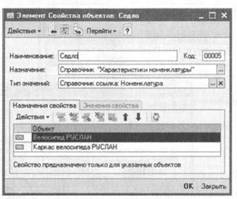Этот способ подбора можно использовать как альтернативу предыдущему способу, когда характеристика выходного изделия влияет на выбор комплектующей выходного изделия, но расход комплектующей не меняется. Используемая комплектующая (являющаяся элементом справочника «Номенклатура») должна быть указана как свойство выходного изде лия. Для этого в плане видов характеристик «Свойства объектов» нужно создать элемент свойство, специально предназначенное для справочника «Характеристики номенклатуры». В качестве типа значений нового элемента следует указать справочник «Номенклатура», а на закладке «Назначения свойства» перечислить конкретные элементы справочника «Номенклатура», для которых предназначено новое свойство.