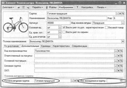 При автоматическом формировании уточненного плана по данным укрупненного плана программе приходится решать более сложную задачу разделения показателей каждой номенклатурной группы среди позиций номенклатуры. Для решения задачи в информационной базе задается профиль распределения номенклатурной группы по входящим в ее состав позициям номенклатуры. В форме элемента справочника «Номенклатуры» указывается вес вхождения позиции номенклатуры в номенклатурную группу. Если вес не указан, он принимается равным нулю. Здесь важно правильно указать вес вхождения в группу относительно весов других позиций номенклатуры, входящих в ту же группу. Сам профиль распределения рассчитывается автоматически.