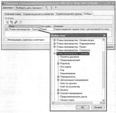 Например, указав условия отбора, можно автоматически заполнить документ, планирующий продажи только готовой продукции (имея в виду, что если предприятие еще торгует товарами, закупаемыми у сторонних организаций, то планирование этого вида деятельности будет выполнено другим документом).