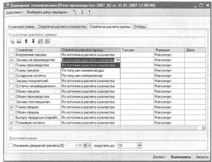 Суммы (для рассчитанных количеств) могут исчисляться по выбранному типу цен номенклатуры, по выбранному типу цен контрагентов или по стратегии, аналогичной стратегии заполнения количеств, выбранной на первой закладке.