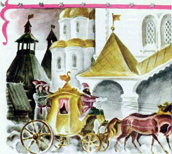 Подлетела к царскому крыльцу золочёная коляска, в шесть лошадей запряжена, и вышла оттуда Василиса Премудрая такая красавица, что ни вздумать, ни взгадать, только в сказке сказать! Взяла Ивана-царевича за руку и повела за столы дубовые, за скатерти браные.