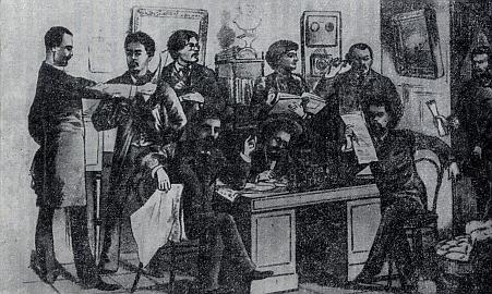 Редакционный день 'Будильника. Рис. М. М. Чемоданова, 1885 г.'