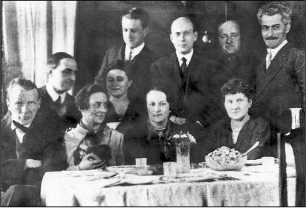 М.А. Булгаков в компании друзей. Снято в другое время и в другом месте, но тоже в гостях у Стронских. Москва, Чистый (Обухов) переулок, д. 1, кв. 14. Сидят (слева направо): М.А. Булгаков, художник Б.В. Шапошников, Л.Е. Белозерская, М.А. Чимишкиан, Н.К. Шапошникова, В.Я. Стронская. Стоят: И.Н. Стронский, Н.Н. Лямин, Н.М. Стронский, неизвестный (квартирант Стронских, доктор Х.). Фотография Н.А. Ушаковой из фондов музея «Булгаковский дом»,1926 г.