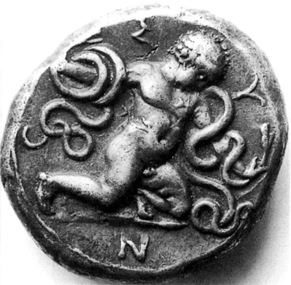 Геракл душит змей в колыбели. Монета, отчеканенная в честь союза со Спартой. Геракл символизирует Спарту, а змеи афинскую демократию