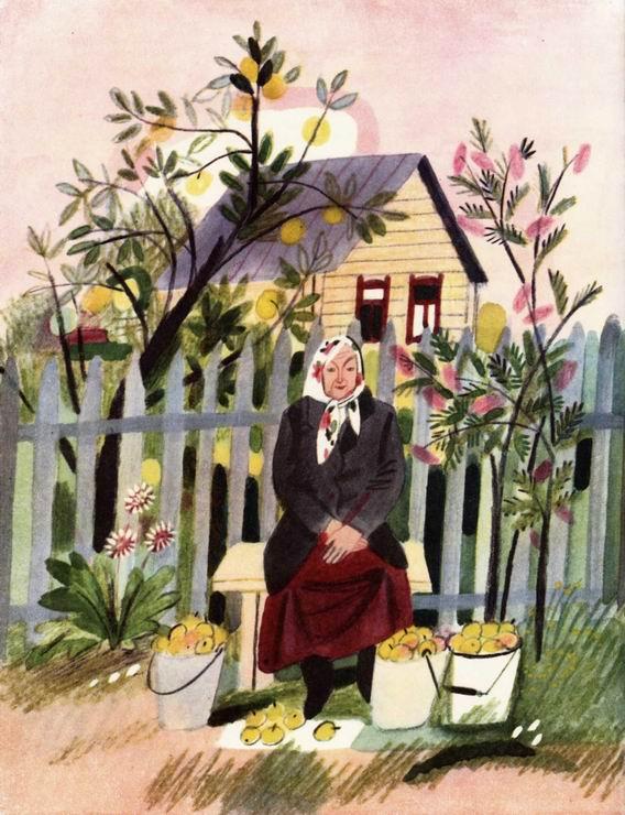 Целый день работают они. Бабка торгует, яблоня яблоки роняет. Так и живут.