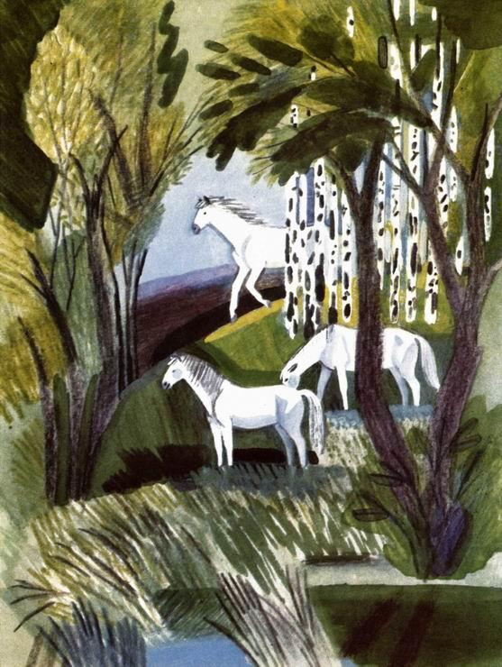 И тут вышли из зарослей три белых коня, глядят на меня в глаза, всё понимают.