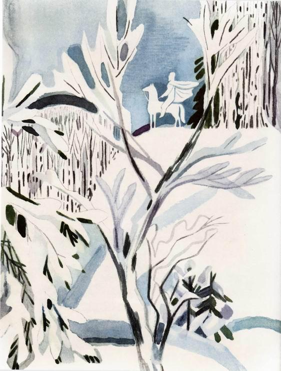 На белой лошади скачет он по заснеженным оврагам, по сосновым борам, по берёзовым рощам.