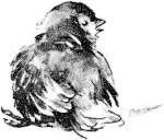 Я глянул вдоль аллеи и увидал молодого воробья с желтизной около клюва и пухом на голове. Он упал из гнезда (ветер сильно качал берёзы аллеи) и сидел неподвижно, беспомощно растопырив едва прораставшие крылышки.