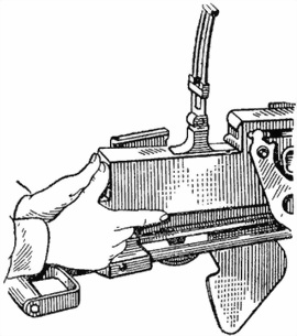 коробки, уперев большие пальцы в задний обрез ствольной коробки (рис. 6), и подать ее назад; если коробка не сдвигается усилиями рук, сдвинуть ее с места легкими ударами деревянного молотка по переднему торцу правой проушины.
