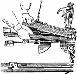 встать впереди хода станка спиной к дульной части пулемета, упереться левой ногой в ход станка, взяться обеими руками за направляющую трубку поршня (рис. 4), оттянуть ее до отказа на себя и повернуть справа налево до выхода упора трубки из фигурного паза ствола.