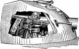 Подача патронов в приемник при стрельбе производится из металлической ленты, уложенной в коробку.