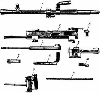 1 ствол; 2 ствольная коробка с прицелом; 3 замыкатель ствола; 4 затворная рама с поршнем; 5 затвор; 6 рукоятка перезаряжания; 7 затыльник; 8 возвратно-боевая пружина; 9 приемник; 10 спусковой механизм
