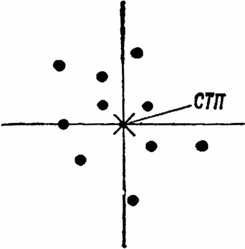 Если кучность расположения пробоин нормальная, командир определяет среднюю точку попадания (СТП) и ее положение относительно контрольной (КТ).