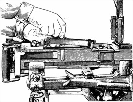 ползун с пальцами подачи от ствольной коробки: левой рукой откинуть вниз правый щиток ползуна, правой рукой выдвинуть ползун вправо и отделить его от ствольной коробки; отпустить щиток.