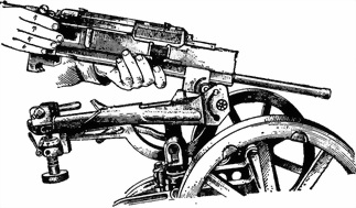 с колесным станком переднюю скобу ствольной коробки надеть вырезом на ось переднего упора станка; опуская задний конец ствольной коробки, поместить заднюю скобу между стенками заднего упора и соединить ее с лодыжкой; повернуть рукоятку заднего упора назад до отказа;