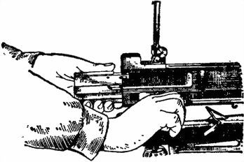 При отделении ствольной коробки от колесного станка левой рукой повернуть рукоятку заднего упора вперед до отказа; правой рукой приподнять заднюю часть ствольной коробки, а левой взять, ствольную коробку снизу у передней скобы и снять ее со станка (рис. 11).