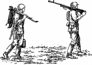 С пулеметом в разобранном виде наводчик отделяет тело пулемета от станка и берет его для переноски, как удобнее, помощник наводчика закрепляет механизмы наводки в горизонтальном положении, кладет станок на спину или берется за хобот для передвижения станка на катках, берет коробку с патронами (рис. 50); помощник наводчика пулемета на треножном станке переводит станок в положение «по-походному», кладет его на плечи и в правую руку берет коробку с патронами (рис. 51).