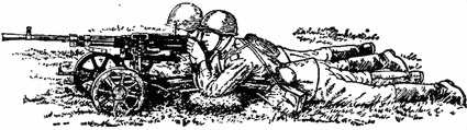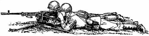 При изготовке к стрельбе лежа (рис. 53) наводчик ложится за пулеметом без напряжения корпуса, локти упирает в подлокотники (при стрельбе из пулемета с треножным станком наводчик упирает локти в грунт) так, чтобы они не скользили, ноги свободно вытягивает, слегка раскинув их и развернув ступни носками наружу; помощник наводчика ложится с правой стороны от наводчика несколько впереди него, чтобы удобно было вкладывать ленту в приемное окно приемника и помогать наводчику в ведении огня; кроме того, он должен быть готов к немедленному открытию огня из автомата.