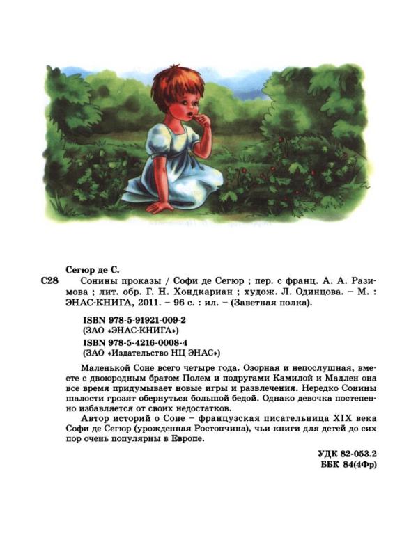 Автор историй об озорной и непослушной девочке Соне французская писательница XIX века Софи де Сегюр (урожденная Ростопчина), чьи книги для детей до сих пор очень популярны в Европе.