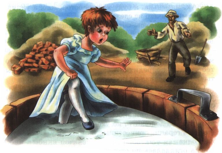 И вот Соня ступила на известку, думая, что она такая же твердая, как земля, но нога провалилась. Чтобы не упасть, она ступила другой ногой и до колен ушла в известку. Тут Соня закричала. Подбежал испуганный каменщик, вытащил ее, поставил на землю и говорит: