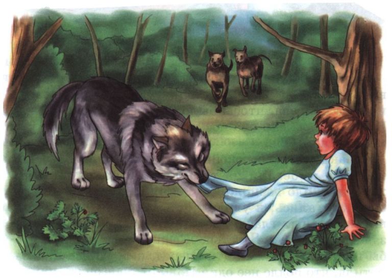 Вдруг две собаки жалобно заскулили и бросились к Соне со всех ног. И тут же огромный волк с горящими глазами и разинутой пастью осторожно высунул морду из-за дерева. Увидев собак, он чуть помедлил, но потом бросился на девочку.