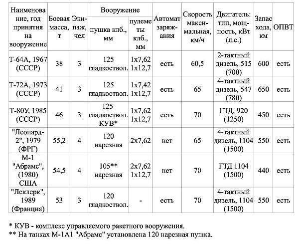 Сравнительные характеристики отечественных и зарубежных танков приведены в таблице.