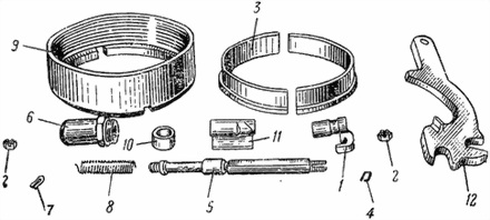 1 рычаг (15); 2 гайки (7); 3 разрезное кольцо (12); 4 пружинный шплинт (13), 5 ось (3); 6 колпачок (10); 7 шплинт (ГОСТ 397-41); 8 пружина (6); 9 втулка (7); 10 шайба (4); 11 лопатка (5); 12 комбинированный ключ (Сб51-1)
