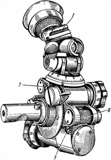 Для быстрого поворота головки 10 на большой угол (при грубой установке угломера) служит отводка 8 червячного винта. При нажатии отводки вниз до отказа червячный винт выходит из зацепления с зубьями шестерни, вследствие чего головку можно повернуть рукой и грубо установить по шкале угломерного кольца скомандованный угломер. После выполнения грубой установки угломера отводку надо отпустить. Точная установка после этого выполняется по шкале 17 барабанчика угломера.