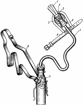 Прибор состоит из провода 1 с патроном и фишкой, рефлектора 3, лампы 4 синего света, основания 8, коробки 5 с аккумуляторами и ремня 6 для ношения аккумулятора. Основание 8 имеет петлю 7 для надевания на указательный палец левой руки и ремень 9 для крепления основания на руке. На лицевой стороне основания имеется кронштейн 2, в отверстие которого вставлен и закреплен рефлектор 3 с патроном и лампой 4 синего света.