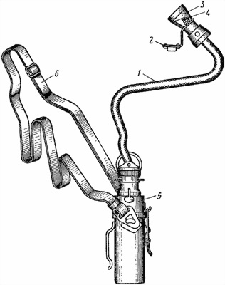 1 провод с патроном и фишкой; 2 кронштейн; 3 рефлектор; 4 лампа; 5 коробка с аккумуляторами; 6 ремень