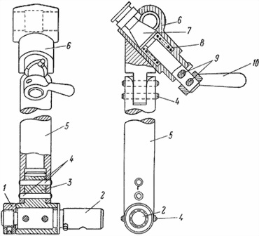 Стойка (рис. 37) состоит из втулки 3 с гайкой 1 и пальцем 2, стойки 5 и держателя 6, в котором собрано устройство, аналогичное по своей конструкции с переходным кронштейном (см. рис. 17). Палец 2 (см. рис. 37) с втулкой 3 со стойкой 5, а также стойка 5 с держателем 6 соединяются при помощи штифтов 4.