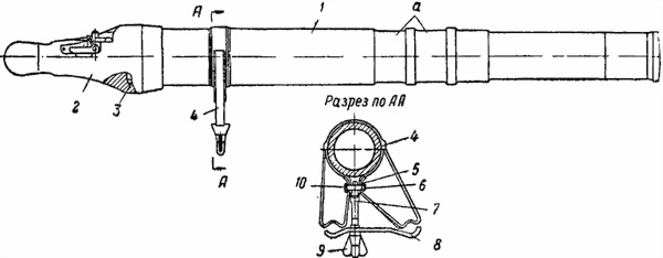 В средней части трубы имеются две кольцевые выточки а, в которые помещается обойма двуноги-лафета; ближе к казенной части на трубе имеется кольцевая выточка для крепления хомута 4. Кроме того, для проверки нулевой линии прицеливания на трубе имеются контрольная площадка и продольная белая полоса.