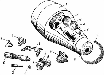 1 корпус казенника (1-80); 2 ось крючка (1-33); 3 ручка переключателя (Сб1-5); 4 крючок (1-32); 5 переключатель (1-81); 6 установочный винт (1-37); 7 рычаг ударника (Сб1-6); 8 ручка рычага со звеном (Сб1-7); 9 штифт (1-82); 10 ударник (Сб1-2); 11 ударный механизм (Сб1-15); г площадка; д отверстие для переключателя; е окно; з выемка; и шаровая пята; к отверстие; Ж и С буквы, определяющие положение переключателя