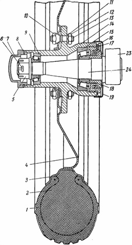 После чистки и смазывания механизма или замены неисправных деталей необходимо через масленку ввести в канал шипа 27 такое количество смазки, чтобы она вышла на поверхность шипа через отверстие б. После этого протереть и смазать втулки 25 и 26 кронштейна.